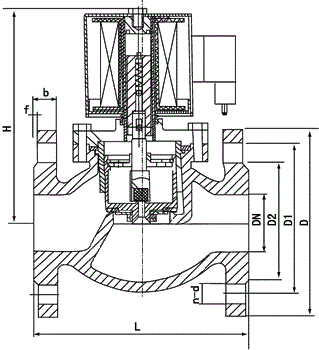 本閥為分步動作直接先導式電磁閥,可根據斷電時所處開、關狀態的不同,可分為常閉式電磁閥和常開式電磁閥。常閉電磁閥,線圈通電后,銜鐵在電磁力作用下先帶動副閥閥塞提起,主閥閥杯上的流體經副閥流走,減少了作用在主閥閥杯上的壓力,當主閥閥杯上的壓力減少到一定值時,銜鐵帶動主閥閥杯,并利用壓差而使主閥閥杯開啟,介質流通。線圈斷電后,電磁力消失,銜鐵因自重下落復位。同時依靠介質壓力,主副閥得以緊密關閉。常開電磁閥,線圈通電后由于吸力作用,動鐵芯下移,把副閥閥塞壓下,副閥關閉,主閥閥杯內壓力上升,當壓力升到一定值時,主閥閥杯的上下壓差一樣,由于電磁力作用,動鐵芯推動主閥閥杯下,壓緊主閥閥座,閥門關閉。線圈斷電時,電磁吸力為零,副閥閥塞和動鐵芯由于彈簧作用向上提起,副閥打開,主閥閥杯上的流體經副閥流走,減少了作用在主閥閥杯上的壓力,當主閥閥杯上的壓力減少到一定值時,利用壓差把主閥閥杯推起,主閥打開,介質流通